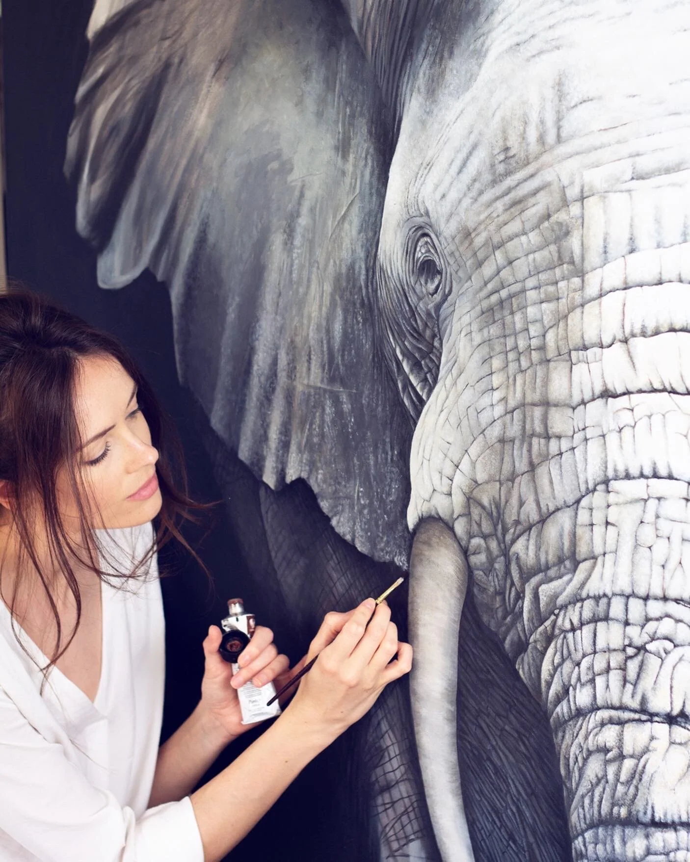 I posted a few clips on my social media of me working on this guy and have uploaded the full video to show quite how large we are talking. Even work on a small part of the elephant's ear has taken me quite a while. Being dry, cracked and crinkly, elephant skin has a very different texture to anything that I am used to painting and I have learnt a lot along the way.